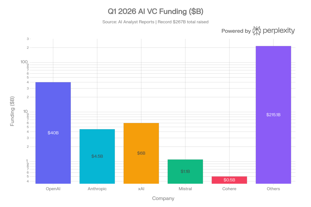 Q1 2026 alone saw a record $267.2 billion in AI venture capital funding — an amount that dwarfs any prior quarter in history. OpenAI led named recipients with $40B, followed by xAI ($6B) and Anthropic ($4.5B), with the remainder spread across the broader AI ecosystem.