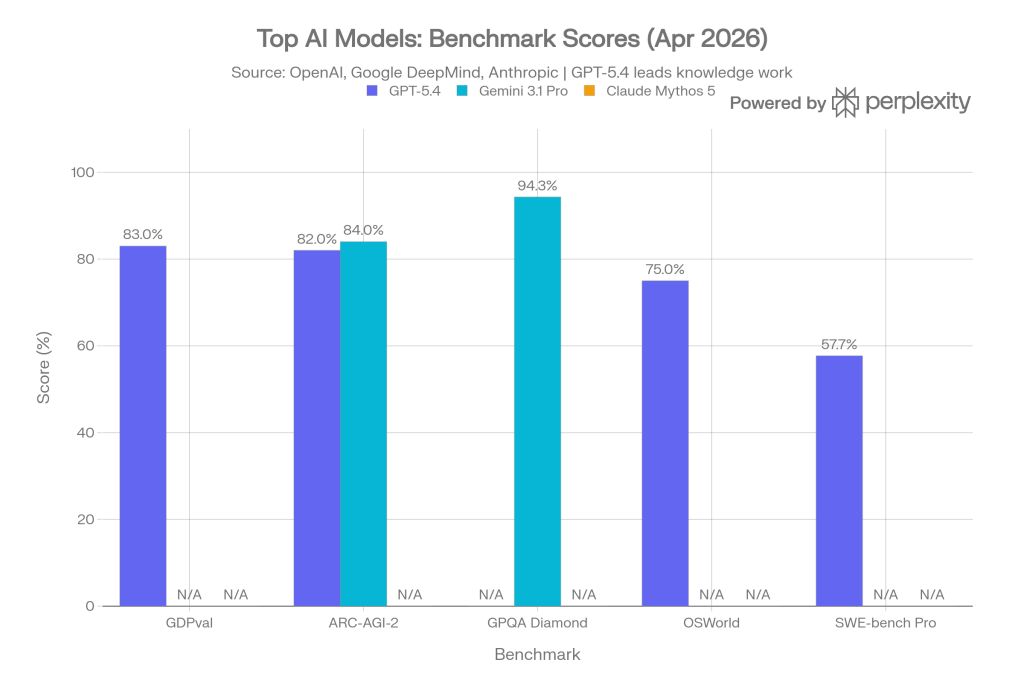 GPT-5.4 leads on real-world knowledge work with an 83% GDPval score, while Gemini 3.1 Pro leads on abstract reasoning (ARC-AGI-2: 84%) and multimodal tasks. Claude Mythos 5 — potentially the most capable model ever built — has been withheld from public release entirely.